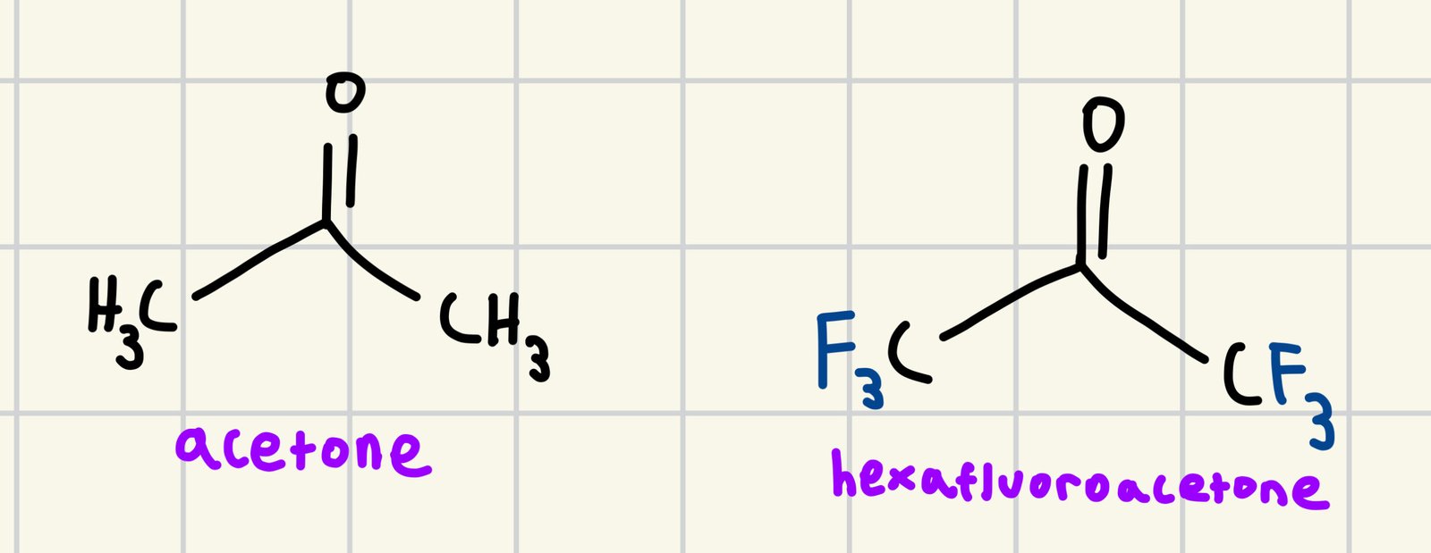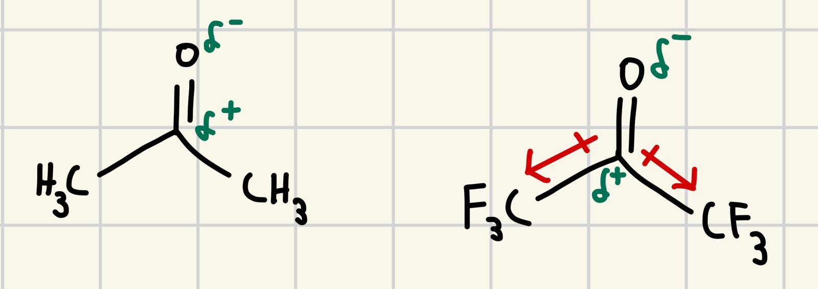 Both compounds contain a carbonyl carbon which is partially positive because of electron density being drawn to the more electronegative oxygen. Also note the slight difference in the two compounds. Acetone has two methyl (-CH3) groups, while hexafluoroacetone has two trifluoromethyl (-CF3) groups. Think about these differences.